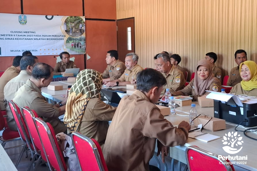 MOJOKERTO, PERHUTANI (25/06/2024) | Perhutani Kesatuan Pemangkuan Hutan (KPH) Mojokerto menggelar closing meeting bersama Cabang Dinas Kehutanan (CDK) wilayah Bojonegoro dalam rangka evaluasi terhadap pelaksanaan Rencana Teknik Tahunan (RTT) semester II tahun 2023 di wilayah Mojokerto. Acara ini digelar di aula kantor CDK wilayah Bojonegoro pada Selasa (25/6).