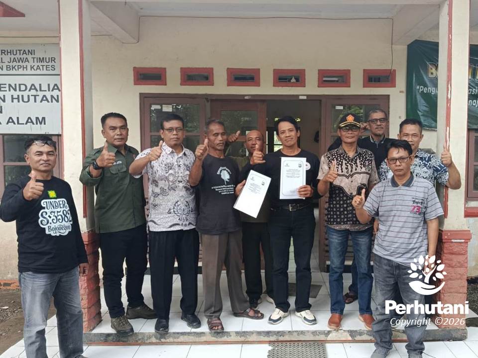 PADANGAN, PERHUTANI (27/02/2026) | Perhutani Kesatuan Pemangkuan Hutan (KPH) Padangan melaksanakan sosialisasi dan serah terima Perjanjian Kerja Sama (PKS) Agroforestry Tahun 2026 bersama Lembaga Masyarakat Desa Hutan (LMDH) Jati Murni dan LMDH Margo Wono Lestari sebagai upaya memperkuat sinergi pengelolaan hutan berbasis kemitraan yang digelar di Kantor Bagian Kesatuan Pemangkuan Hutan (BKPH) Kates, Jumat (27/02).