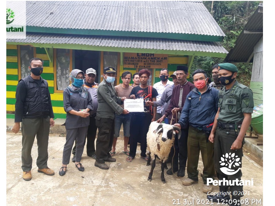 CIANJUR, PERHUTANI (21/07/2021) | Sebagai salah satu bentuk kepedulian kepada masyarakat, Perhutani Kesatuan Pemangkuan Hutan (KPH) Cianjur menyerahkan hewan kurban jenis domba kepada tenaga sadap sebanyak 4 ekor dan kepada tenaga produksi kayu sebanyak 2 ekor, bertempat di kantor Bagian Kesatuan Pemangkuan Hutan (BKPH) Sukanagara Utara, Rabu (21/07).