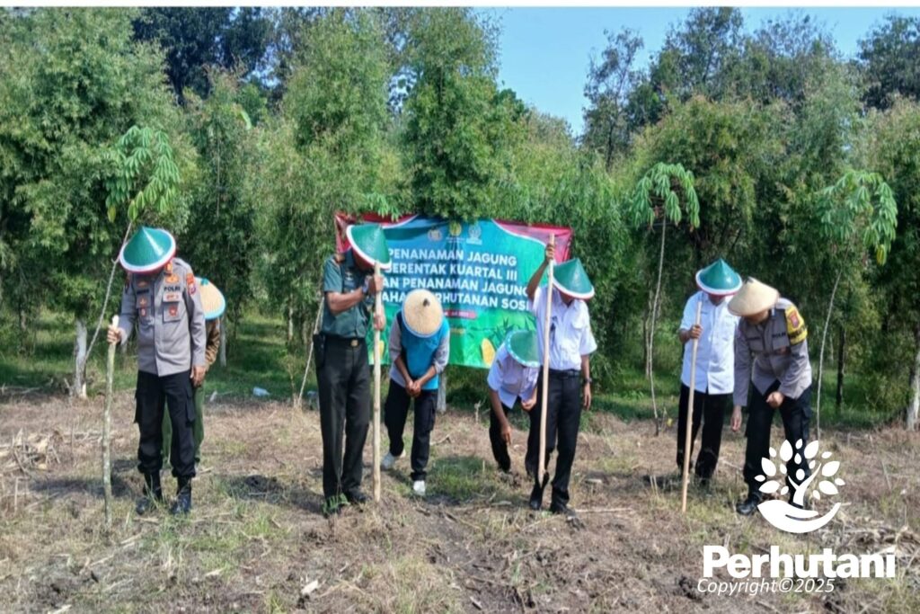 SARADAN, PERHUTANI (10/7/2025) | Perhutani Kesatuan Pemangkuan Hutan (KPH) Saradan mendukung digelarnya penanaman jagung serentak kuartal III yang dilaksanakan oleh Polres Ngawi, bertempat di areal KHDPK, masuk wilayah kerja petak 133a, Resort Pemangkuan Hutan (RPH) Teguhan, Bagian Kesatuan Pemangkuan Hutan (BKPH) Rejuno, pada Rabu (9/7).