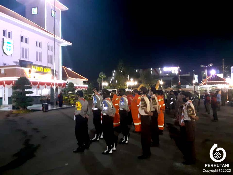 MADIUN, PERHUTANI (3/8/2020) | Pramuka Saka Wanabakti binaan Perhutani Kesatuan Pemangkuan Hutan (KPH) Madiun ikut ambil bagian bergabung bersama Satuan Gugus Tugas (Satgas) Covid-19 Pemerintah Kota Madiun (Pol PP, Babinsa, BPBD, Polisi, Dinas Perhubungan, Pemadam Kebakaran) melakukan sosialisasi protokol kesehatan pencegahan Covid-19 di depan Balai Kota Madiun, Minggu (2/8).