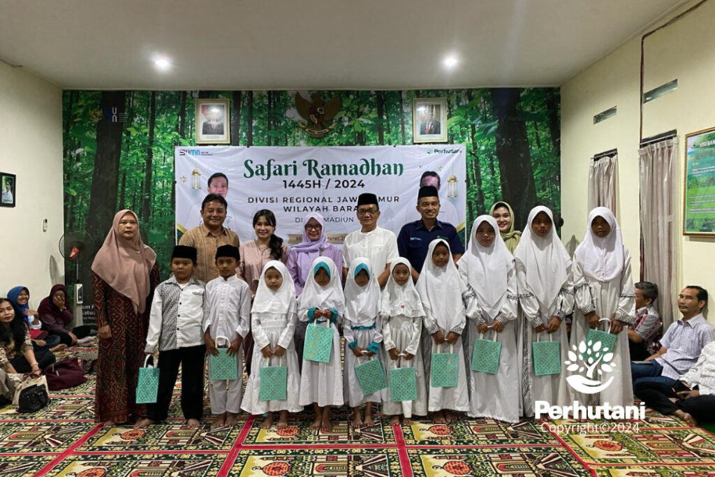MADIUN, PERHUTANI (15/01/2024) | Kepala Perum Perhutani Divisi Regional Jawa Timur (Divre Jatim) Asep Dedi Mulyadi bersama Kepala Kesatuan Pemangkuan Hutan (KPH) Madiun Panca Putra M. Sihite berikan santunan kepada anak yatim pada kegiatan Safari Ramadhan 1445H/2024 Wilayah Barat, bertempat di Aula Kantor KPH Madiun, Kamis (15/3). Pemberian santunan tersebut merupakan salah satu kegiatan dari rangkaian Safari Ramadhan, yaitu agenda rutin tahunan yang digelar setiap bulan Ramadhan sebagai upaya menyambung silaturahmi, pembinaan rohani untuk meningkatkan iman dan taqwa karyawan, sekaligus melakukan evaluasi kinerja.