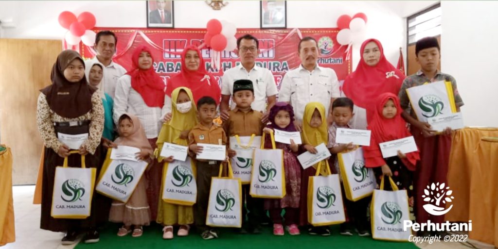 MADURA, PERHUTANI (11/08/2022) | Ikatan Istri Karyawan (IIK) Perhutani Cabang Madura memberikan uang santunan dan perlengkapan alat sholat untuk anak yatim dalam rangka rangka peringatan Hari Ulang Tahun (HUT) Kemerdekaan Republik Indonesia ke-77 yang berlangsung di aula Simonget Kantor KPH Madura, Rabu (10/8).