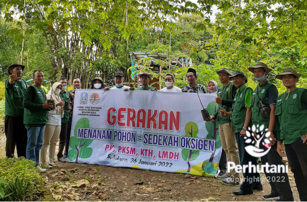 MOJOKERTO, PERHUTANI (30/01/2022) | Perhutani Mojokerto bersama dengan Cabang Dinas Kehutanan (CDK) wilayah kerja Bojonegoro dan Lembaga Masyarakat Desa Hutan (LMDH) Moronyamplung melakukan gerakan menanam pohon dan sedekah oksigen dipetak 42 D Resort Pemangkuan Hutan (RPH) Mantup BKPH Mantup, Minggu (30/1).