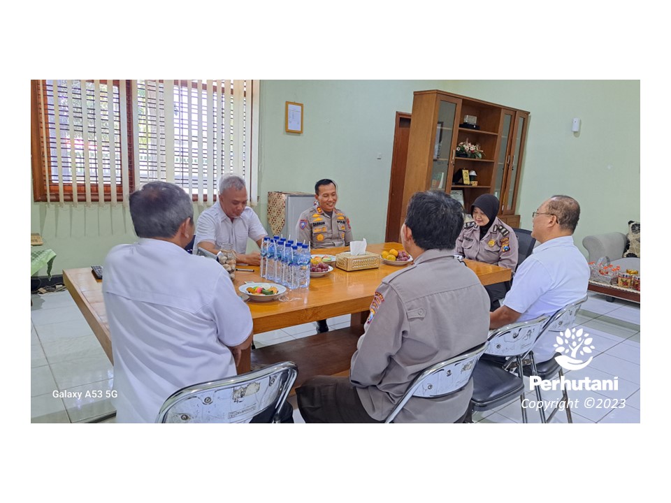 TUBAN, PERHUTANI (04/10/2023) | Administratur Perum Perhutani Kesatuan Pemangkuan Hutan (KPH) Tuban di ruang kerjanya menerima kunjungan kerja Wakil Direktur Bimbingan Masyarakat Polda Jatim bersama jajaran Polres Tuban dari satuan Bimbingan dan Pelayanan Masyarakat, Tuban, Rabu (04/10).