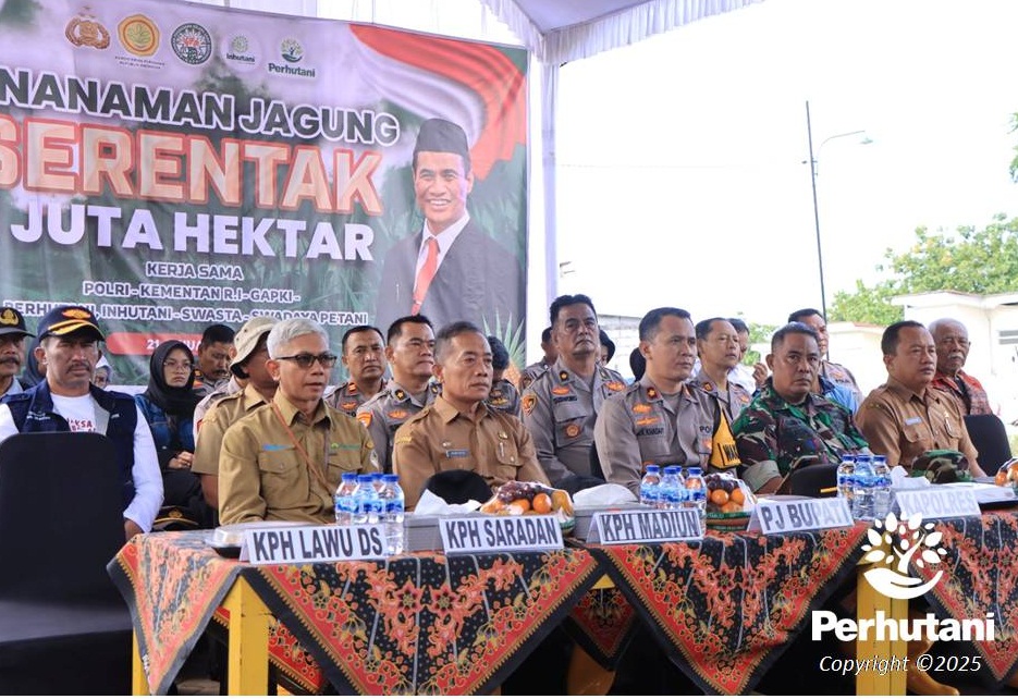LAWU DS, PERHUTANI (22/01/2025) | Perum Perhutani Kesatuan Pemangkuan Hutan (KPH) Lawu Ds bersama Polres Madiun mendukung pelaksanaan penanaman jagung serentak 1 juta hektar yang digelar oleh Polres Madiun. Kegiatan ini berlangsung di lahan pertanian masyarakat di Desa Pilangrejo, yang mencakup sekitar 0,49 hektar dengan jenis jagung Bhayangkara, menggunakan total 15 kg bibit. Kegiatan ini dilakukan pada Selasa (21/01) dan merupakan bagian dari upaya mendukung ketahanan pangan nasional menuju Indonesia Emas 2045 yang dicanangkan oleh Presiden Prabowo Subianto.