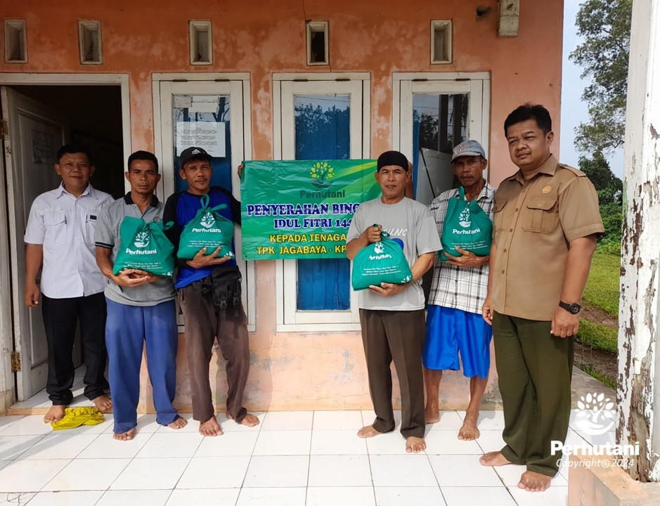 BOGOR, PERHUTANI (05/04/2024) | Perum Perhutani Kesatuan Pemangkuan Hutan (KPH) Bogor bagikan paket sembako kepada tenaga kerja Tempat Penimbunan Kayu (TPK) Jagabaya dalam rangka menyambut Idul Fitri 1445 H, di Desa Gorowong, Kecamatan Parung Panjang, Kabupaten Bogor, pada hari Kamis (04/04).