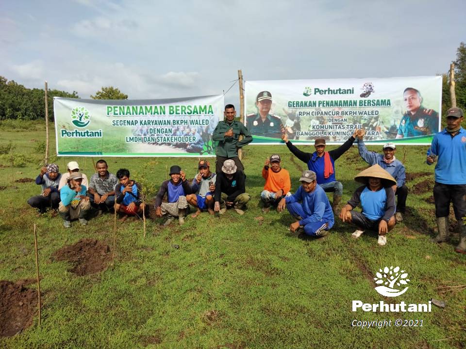 KUNINGAN, PERHUTANI, (18/02/2021) | Perhutani Kesatuan Pemangkuan Hutan (KPH) Kuningan lakukan penanaman bersama sebanyak 6.500 Plances jenis Kayu Putih dengan Komunitas Trail Bonggala Kuningan Utara di Petak 31a seluas 1,7 Ha dan Petak 37e seluas 1,6 Ha, di Kawasan Hutan Resort Pemangkuan Hutan (RPH) Cipancur, Bagian Kesatuan Pemangkuan Hutan (BKPH) Waled, termasuk wilayah Administratif Desa Cipancur, Kecamatan Cidahu, Kabupaten Kuningan pada Rabu (17/02).