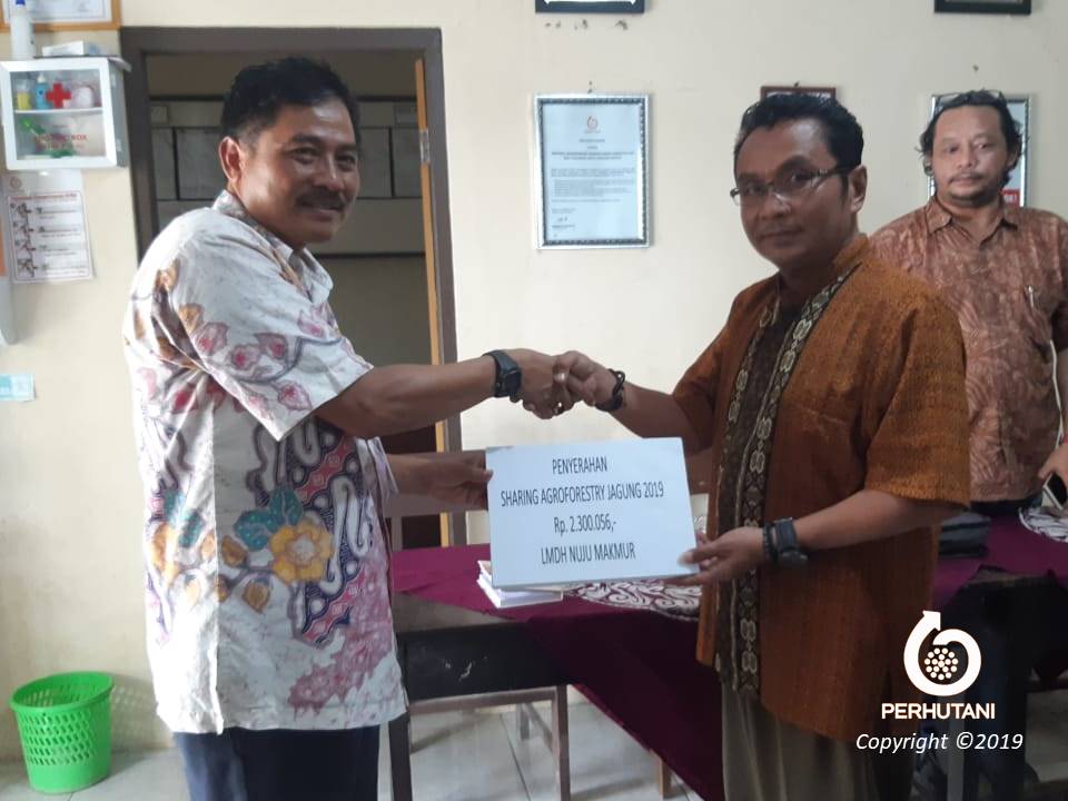 PEMALANG, PERHUTANI (12/12/2019) | Perhutani Kesatuan Pemangkuan Hutan (KPH) Pemalang menyerahkan sharing agroforestry tahun 2019 kepada Lembaga Masyarakat Desa Hutan (LMDH) Nuju Makmur Desa Semedo Kecamatan Kedungbanteng Kabupaten Tegal, di kantor Bagian Kesatuan Pemangkuan Hutan (BKPH) Kedungjati, Kamis (12/12 )