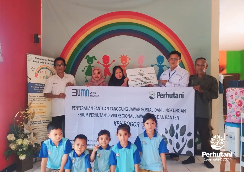 Administratur KPH Bogor melalui Ali menyampaikan bahwa bantuan TJSL Non-PUMK dari Perhutani KPH Bogor digunakan untuk penyediaan sarana edukasi anak usia dini kepada Bimba Rainbow Kids senilai Rp10.000.000,- (sepuluh juta rupiah).