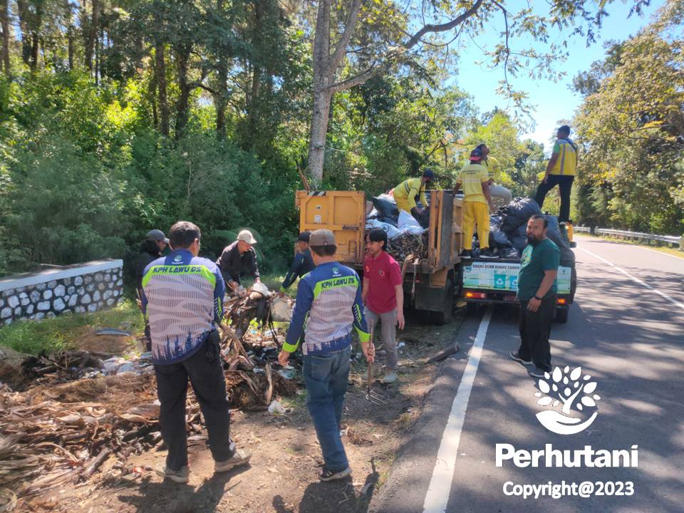 LAWU DS, PERHUTANI (02/09/2023) | Perum Perhutani Kesatuan Pemangkuan Hutan (KPH) Lawu Ds bersama Forum Komunikasi Pimpinan Kecamatan (Forkopimcam) Plaosan, melakukan aksi bersih-bersih area wisata Gunung Lawu, masuk wilayah Resort Pemangkuan Hutan (RPH) Sarangan, Bagian Kesatuan Pemangkuan Hutan (BKPH) Lawu Selatan, Kabupaten Magetan, Jumat (01/09).