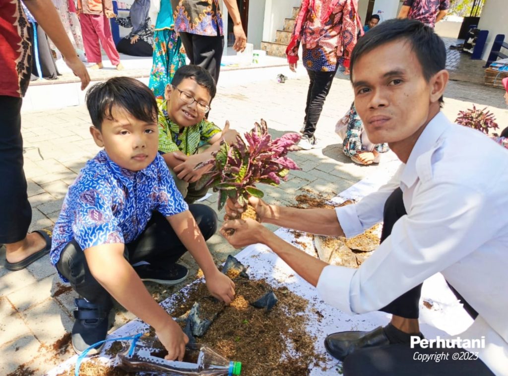 MADURA, PERHUTANI (02/10/2023) | Tingkatkan mutu pendidikan melalui studi alam, outdoor classroom, Perhutani Kesatuan Pemangkuan Hutan (KPH) Madura kunjungi Sekolah Dasar Islam Terpadu (SDIT) Al-Uswah dalam rangka memberikan teknik menanam pohon dan implementasi merawatnya, yang bertempat di Jl. Lawangan Daya, Kecamatan Pademawu, Kabupaten Pamekasan Senin (02/10).