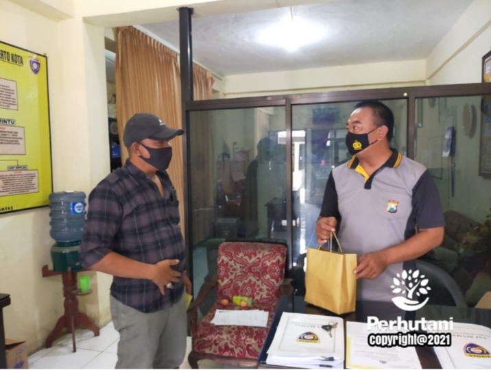 Bantuan minyak kayu putih sebanyak 200 botol diserahkan oleh Administratur Perhutani KPH Mojokerto melalui Komandan Regu Polisi Hutan Mobil (Polhutmob) Tacuk Budiono kepada Kepolisian Resort (Polres) Mojokerto Kota, Kamis (15/7).