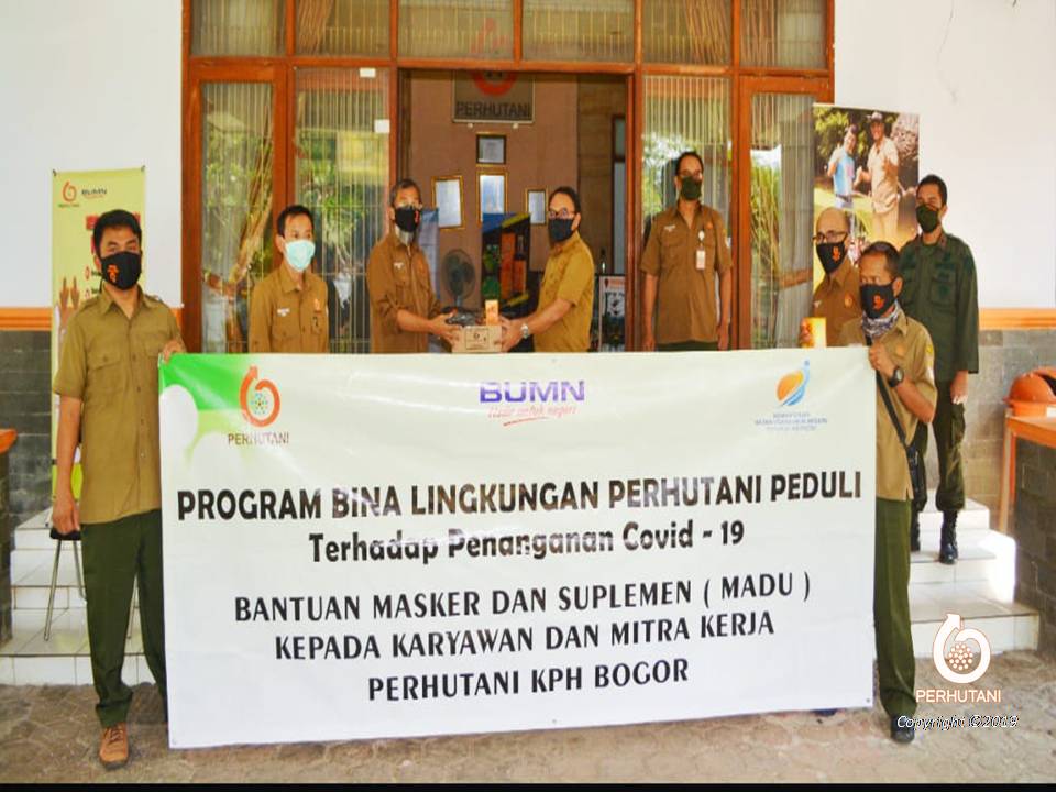 BOGOR, PERHUTANI (05/05/2020) | Perhutani Kesatuan Pemangkuan Hutan (KPH) Bogor terus berupaya memproteksi karyawannya dari penyebaran virus Corona (Covid-19), diantaranya melalui pembagian 1.030 buah masker serta 428 botol madu untuk pegawai dan mitra kerja. Penyerahan dilakukan secara serentak di delapan wilayah unit kerja meliputi kantor KPH Bogor, Bagian Kesatuan Pemangkuan Hutan (BKPH) Bogor, Jasinga, Leuwiliang, Jonggol, Parung Panjang, Ujung Kerawang, Pabrik Industri Madu dan TPK (Tempat Penimbunan Kayu), Selasa (05/05).