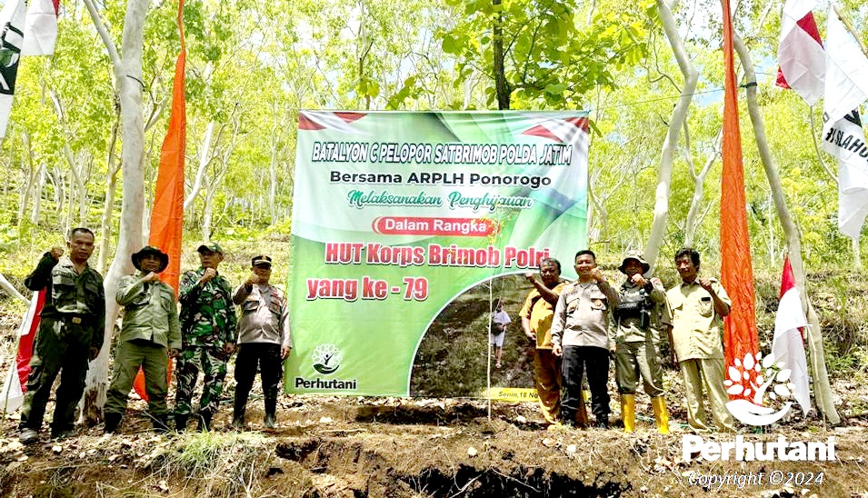 LAWU DS, PERHUTANI (20/11/2024) | Perum Perhutani Kesatuan Pemangkuan Hutan (KPH) Lawu Ds bersama Brimob Madiun Batalyon C Pelopor Satbrimob Polda Jatim melaksanakan kegiatan penanaman pohon di sekitar sumber mata air Dusun Banyu Uripan, Desa Duri, Kecamatan Slahung, Kabupaten Ponorogo, pada Senin (18/11). Kegiatan ini dilakukan dalam rangka memperingati HUT Korps Brimob Polri ke-79, dengan menggandeng Komunitas Aliansi Relawan Peduli Lingkungan Hutan (ARPLH) Ponorogo.