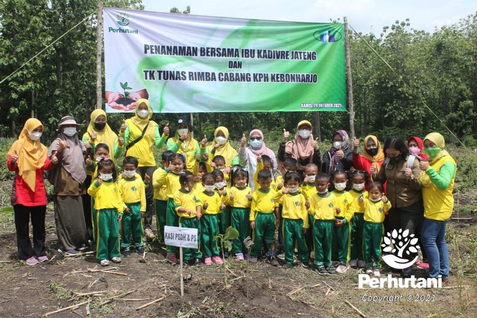 KEBONHARJO, PERHUTANI (29/10/2021) | Perum Perhutani Kesatuan Pemangkuan Hutan Kebonharjo (KPH) Kebonharjo bersama Yayasan Tunas Rimba Perhutani (YTRP) melaksanakan penanaman bersama siswa TK Tunas Rimba II Kebonharjo di petak 108d Bagian Kesatuan Pemangkuan Hutan (BKPH) Ngandang, Kamis (28/10).