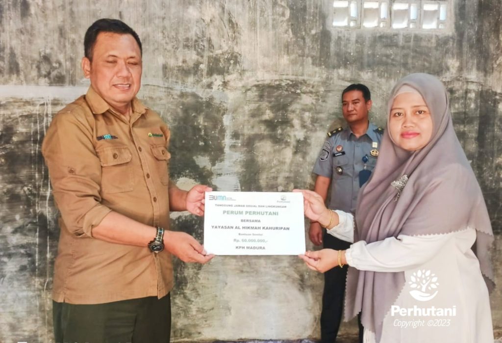 MADURA, PERHUTANI (29/08/2023) | Administratur Perum Perhutani Kesatuan Pemangkuan Hutan (KPH) Madura menyerahkan bantuan hibah secara simbolis dana program Tanggung Jawab Sosial dan Lingkungan (TJSL) senilai Rp 60 juta, kepada Yayasan Al-Hikmah Kahuripan, guna rehabilitasi sarana prasarana pendidikan/ruang kelas di Desa Larangan Luar, Kecamatan Larangan, bertempat di Kantor/Madrasah Diniyah Darul Hikmah Pamekasan, Selasa (29/08).