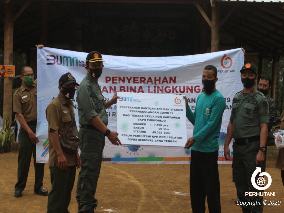 Penyerahan masker, vitamin dan sabun cuci tangan dilaksanakan secara simbolis oleh Administratur KPH Kedu Selatan Yudha Suswardhanto kepada Giyo dan Bitun perwakilan penyadap getah wilayah kerja Resort Pemangkuan Hutan (RPH) Loano Bagian Pemangkuan Hutan (BKPH) Purworejo.