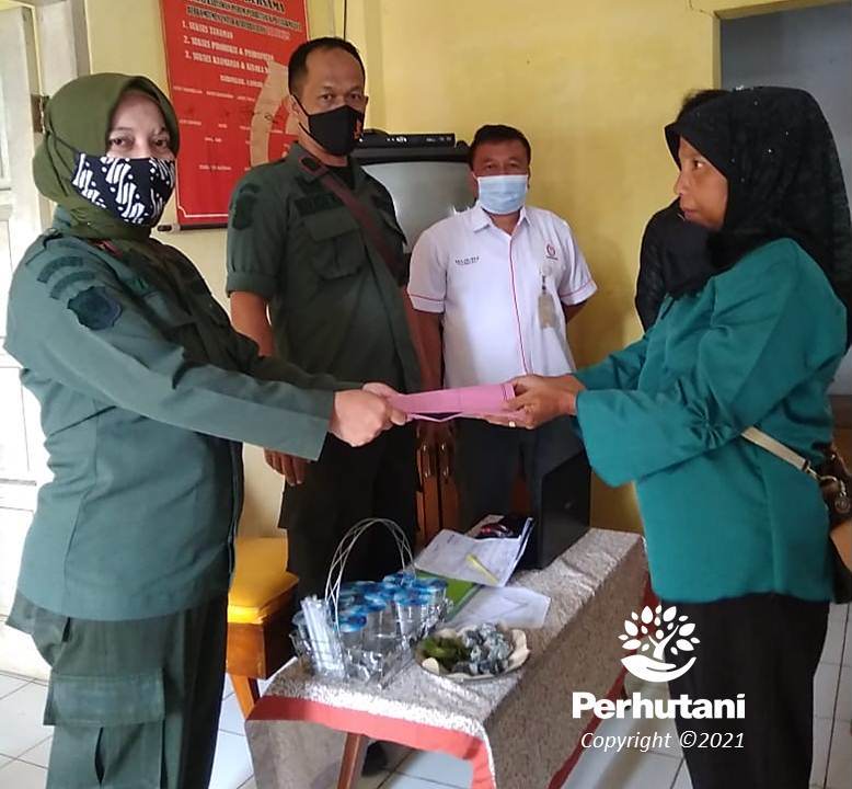 PERHUTANI, TASIKMALAYA (04/02/2021) | Perhutani Kesatuan Pemangkuan Hutan (KPH) Tasikmalaya menyerahkan bantuan klaim Asuransi Kematian dari PT Asuransi Amanah Ghita kepada penyadap getah pinus yang meninggal dunia atas nama Ajo (56 tahun) sebesar Rp 16.800.000,- yang diserahkan langsung oleh Wakil Administratur KPH Tasikmalaya, Yuyu Rahayu kepada ahli waris istri almarhum Asoh bertempat di Kantor BKPH Taraju pada Kamis (03/02)