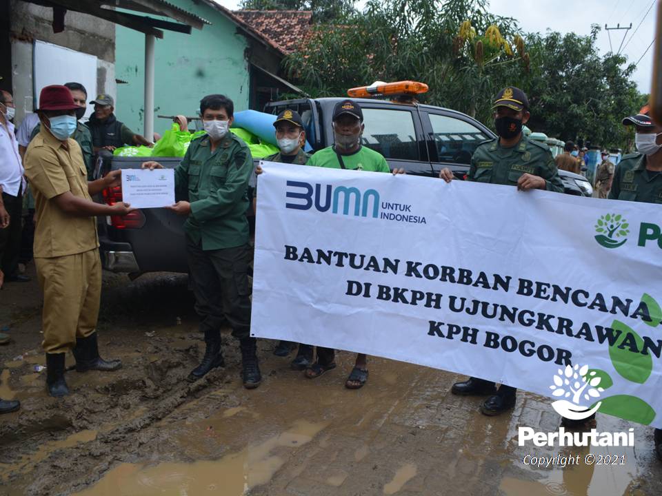 BOGOR, PERHUTANI (18/02/2021) | Perhutani Kesatuan Pemangkuan Hutan (KPH) Bogor menyerahkan 500 paket bantuan logistik berupa sembako kepada masyarakat yang terdampak banjir di Desa Harapan Jaya, Kecamatan Muaragembong, Kabupaten Bekasi pada Rabu (17/02).