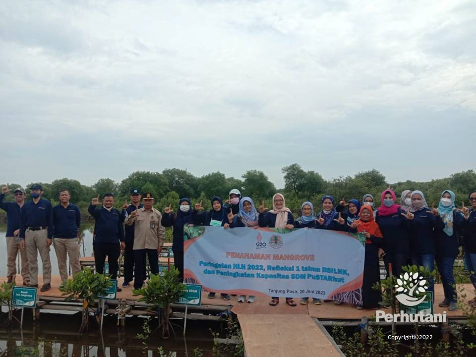 BANTEN, PERHUTANI | (27/06/2022) | Dalam rangka memperingati Hari Lingkungan Hidup Sedunia Tahun 2022, Perhutani Kesatuan Pemangkuan Hutan (KPH) Banten, Badan Standarisasi Instrumen (BSI) Kementerian Lingkungan Hidup dan Kehutanan (LHK) dan Lembaga Masyarakat Desa Hutan (LMDH) melaksanakan penanaman mangrove jenis Rhizopira sp sebanyak 300 plances di kawasan hutan mangrove petak 19 Resort Pemangkuan Hutan (RPH) Tangerang, Bagian Kesatuan Pemangkuan Hutan (BKPH) Serang, Minggu (26/06).