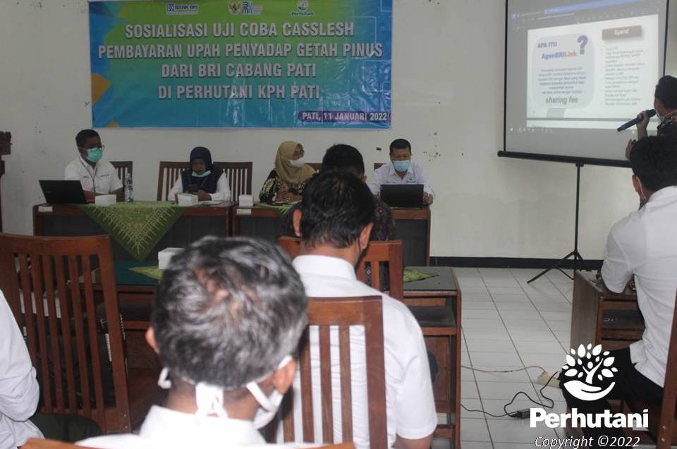 PATI, PERHUTANI (11/01/2022) | Perhutani Kesatuan Pemangkuan Hutan (KPH) Pati bersama dengan Bank Rakyat Indonesia (BRI) Cabang Pati mengadakan sosialisasi uji coba sistem cashless atau pembayaran non tunai bagi tenaga penyadap Getah Pinus, Selasa (11/01).