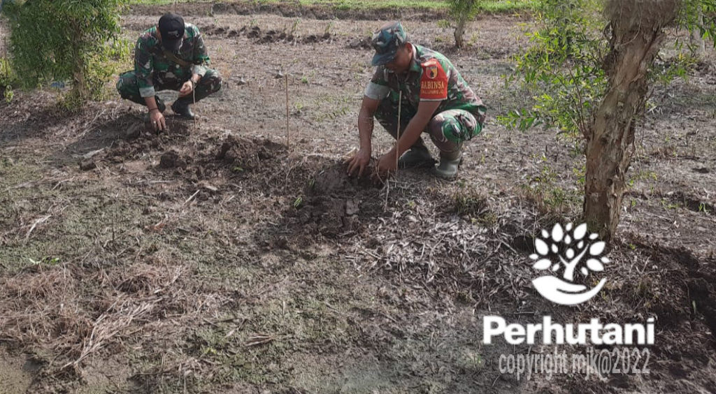 MOJOKERTO, PERHUTANI (27/11/2022) | Perhutani Kesatuan Pemangkuan Hutan (KPH) Mojokerto bersama jajaran Komando Rayon Militer (Koramil) 0812 Lamongan, melakukan aksi tanan pohon bersama bibit kayu putih sebanyak 500 plances di wilayah kerja Resort Pemangkuan Hutan (RPH) Majenon, wilayah Bagian Kesatuan Pemangkuan Hutan (BKPH) Bluluk, masuk Desa Talunrejo, Kecamatan Bluluk, Kabupaten Lamongan, Minggu (27/11).