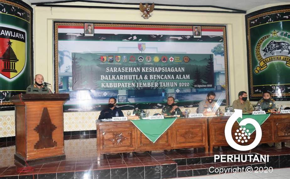 JEMBER, PERHUTANI (12/8/2020) | Mengantisipasi kebakaran hutan dan lahan, Perhutani Kesatuan Pemangkuan Hutan (KPH) Jember bekerjasama dengan Forkopimda (Forum Koordinasi Pimpinan Daerah) Jember menggelar sarasehan siaga pengendalian kebakaran hutan dan lahan (Dalkarhutla) dan bencana alam bertempat di aula Kodim 0824 Jember, Senin (10/8).