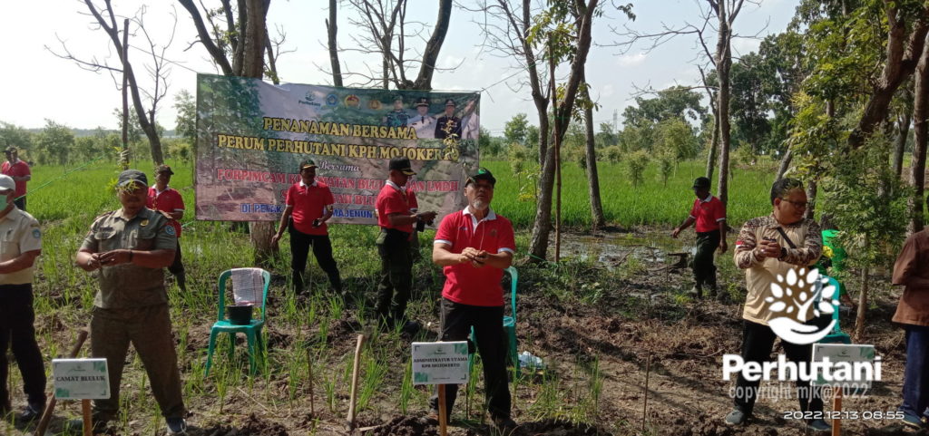 MOJOKERTO, PERHUTANI (13/12/2022) | Dalam rangka mewujudkan hutan lestari, Perhutani Kesatuan Pemangkuan Hutan (KPH) Mojokerto bersama Forum Komunikasi Pimpinan Kecamatan (Forkopimcam) Bluluk dan Perkumpulan Lembaga Masyarakat Desa Hutan (PLMDH), melakukan aksi Tandur Bareng Gawe Alas (Tanam Bersama Bikin Hutan/red) tidak kurang 2000 plances jenis jati dan kayu putih telah ditanam. Hal ini dilakukan dalam rangka menghijaukan lahan hutan petak 16 wilayah Resort Pemangkuan Hutan (RPH) Majenon, Bagian Kesatuan Pemangkuan Hutan (BKPH) Bluluk, Selasa (13/12).