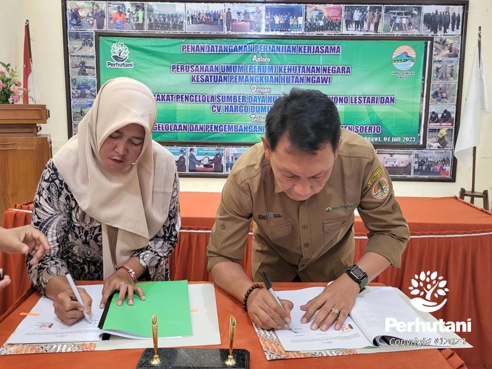 NGAWI, PERHUTANI (04/07/2023) Perhutani Kesatuan Pemangkuan Hutan (KPH) Ngawi bersama Masyarakat Pengelola Sumber Daya Hutan (MPSDH) Wono Lestari dan CV Hargo Dumilah melakukan penandatanganan Perjanjian Kerjasama (PKS) tentang pengelolaan dan pengembangan wana wisata Monumen Soerjo yang berlokasi di Bagian Kesatuan Pemangkuan Hutan (BKPH) Kedunggalar, bertempat di Ruang Tectona Perhutani Ngawi, pada Selasa (04/07).