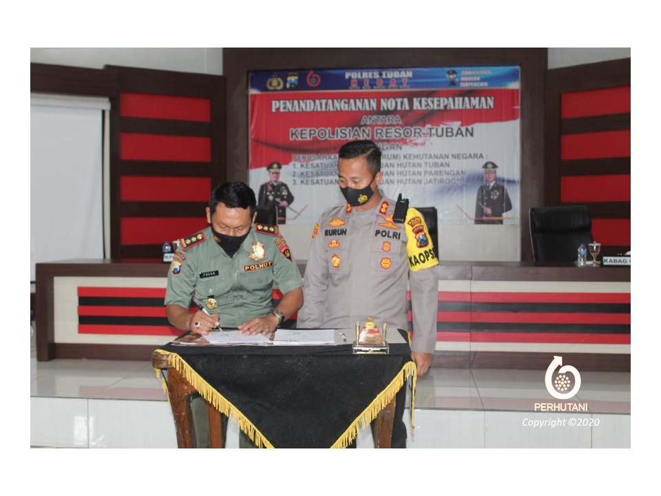 TUBAN, PERHUTANI (28/10/2020) | Perhutani Kesatuan Pemangkuan Hutan (KPH) Tuban bersama Kepolisian Resor (Polres) Tuban melakukan penandatanganan nota kesepahaman tentang perlindungan dan kelestarian hutan bertempat di Gedung Sanika Satyawada Mapolres Tuban, Selasa (28/10).