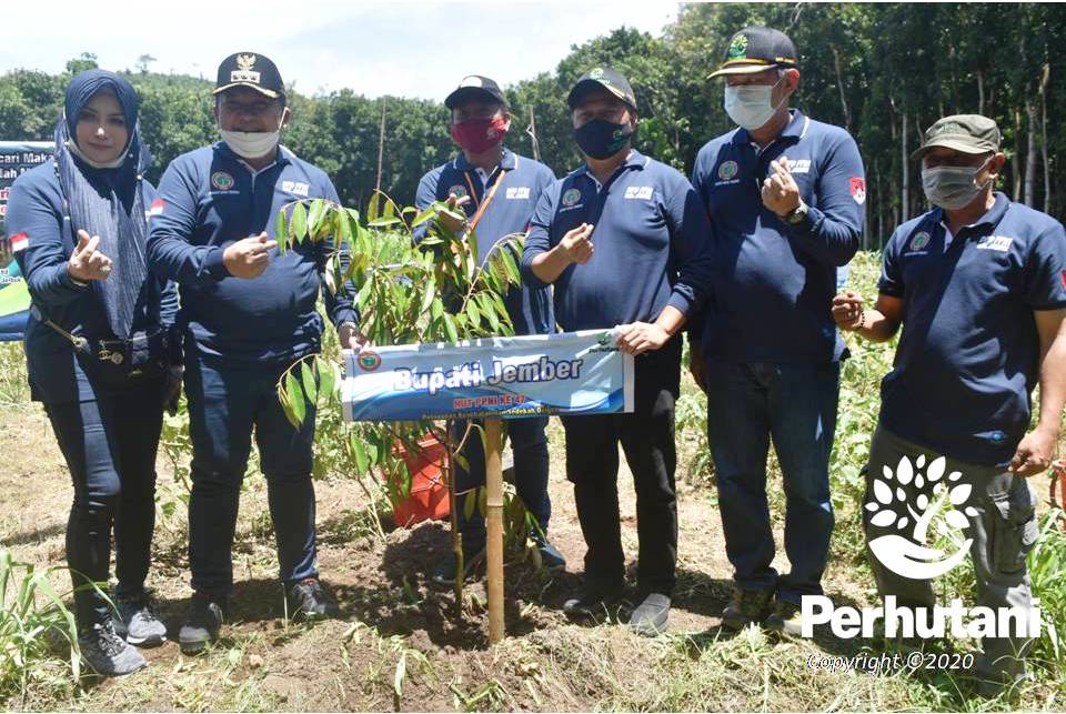 JEMBER, PERHUTANI (31/3/2021) | Perhutani Kesatuan Pemangkuan Hutan (KPH) Jember berkolaborasi dengan Dewan Pengurus Daerah (DPD) Persatuan Perawat Nasional Indonesia (PPNI) Jember menggelar aksi sosial dan penanaman pohon jenis Multi Purpose Tree Species dan jati di kawasan hutan petak 51 Resort Pemangkuan Hutan (RPH) Grintingan, Bagian Kesatuan Pemangkuan Hutan (BKPH) Wuluhan, Selasa (30/3).