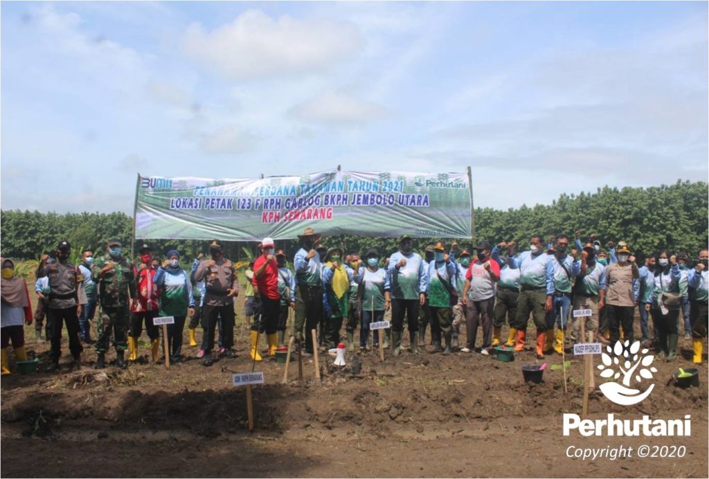 SEMARANG, PERHUTANI (20/01/2021) | Perum Perhutani Kesatuan Pemangkuan Hutan (KPH) Semarang melaksanakan kegiatan penanaman awal tahun bersama Forum Koordinasi Pimpinan Kecamatan (Forkopimca) Karangawen Kabupaten Demak, Pemerintahan Desa Jragung, Lembaga Masyarakat Desa Hutan (LMDH) dan Pramuka Saka Wana Bakti di petak 123f luas 5,4 Ha Resort Pemangkuan Hutan (RPH) Gablok, Bagian Kesatuan Pemangkuan Hutan (BKPH) Jembolo Utara, Rabu (20/01).
