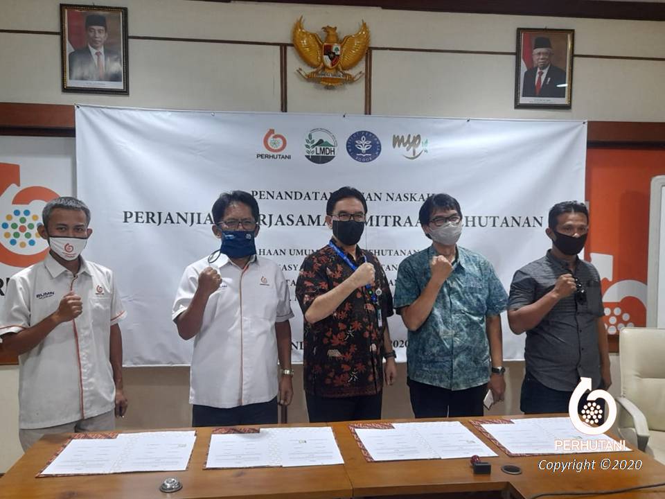 BANDUNG, PERHUTANI (15/7/2020) | Perhutani Kesatuan Pemangkuan Hutan (KPH) Purwakarta bersama Fakultas Kehutanan Institut Pertanian Bogor, Lembaga Masyarakat Desa Hutan (LMDH) Bambu Jaya, dan PT Mitra Selaras Perkasa (MSP) menandatangani naskah Perjanjian Kerjasama (PKS) Kemitraan Kehutanan yang bertempat di Ruang Rapat Rasamala Kantor Divre Janten, Rabu (15/7).