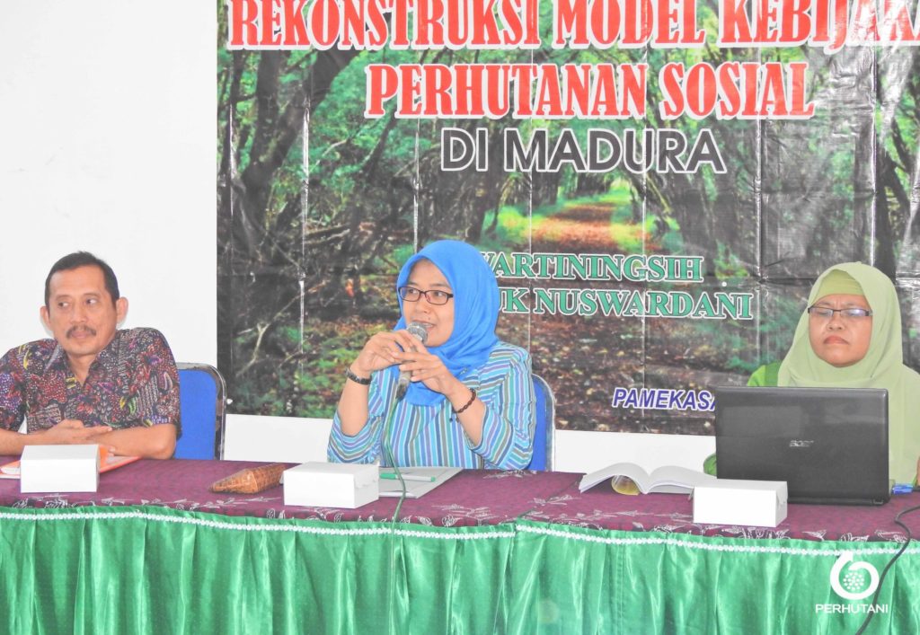 Wartiningsih dari Universitas Tronojoyo Madura sebagai penggagas FGD menjelaskan tujuan dari sosialisasi Rekonstruksi Model Kebijakan PS di Madura dilatar belakangi penelitian tentang penerapan peraturan Mentri Lingkungan Hidup dan Kehutanan No.39/MENKLH/KUM.I/10/2017 tentang Perhutanan Sosial di wilayah kerja Perhutani dan  No. P.83/MENLHK/ SETJEN/KUM.1/6/2016 tentang Perhutanan Sosial. “Ini menjadi penting karena terbitnya kedua Permen tersebut seolah-olah “melegalkan” perambahan kawasan hutan selama ini, di samping itu ternyata banyak memunculkan konflik antara masyarakat (LMDH) dengan pemegang izin perhutanan sosial,” kata Warti.
