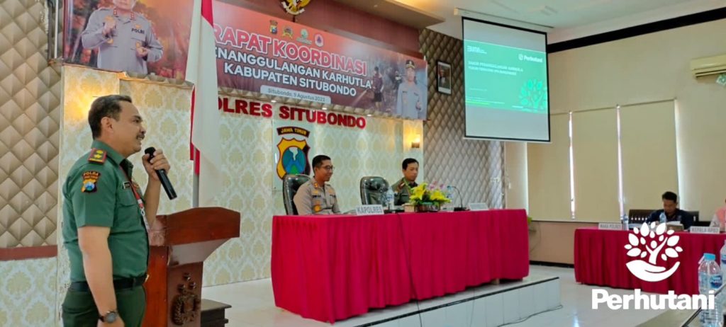 BONDOWOSO, PERHUTANI (09/08/2023) | Perum Perhutani Kesatuan Pemangkuan Hutan (KPH) Bondowoso dan jajaran Perhutani Rayon V menghadiri Rapat Koordinasi Penanggulangan Karhutla bersama dinas terkait seperti Badan Penanggulangan Bencana Daerah (BPBD), Satuan Pol PP, Dinas Kehutanan, Balai Taman Nasional serta TNI/Polri bertempat di Ruang Rupatama Tri Brata Polres Situbondo, Rabu (09/08).