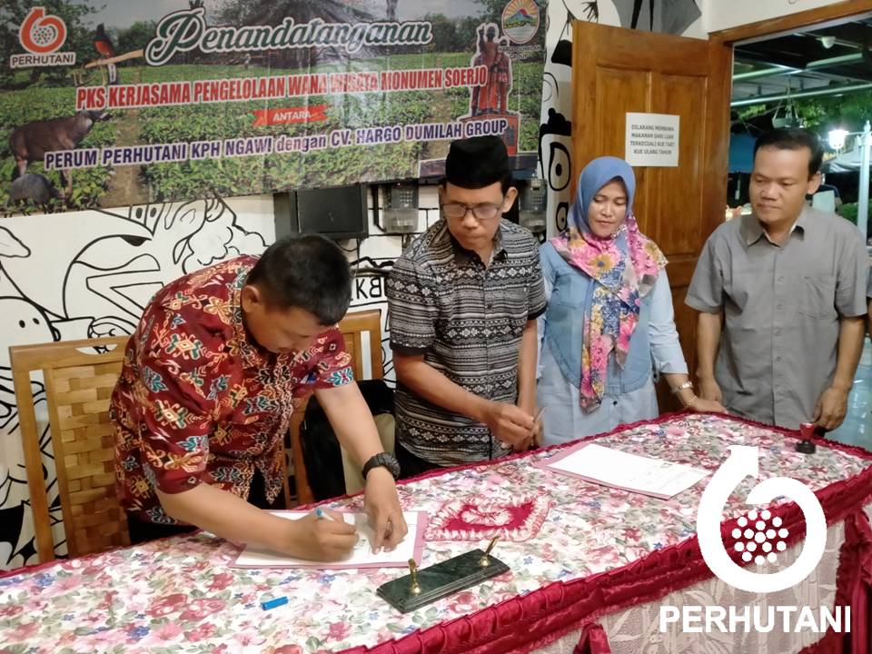 NGAWI, PERHUTANI (24/12/2019) | Perhutani Kesatuan Pemangkuan Hutan (KPH) Ngawi dan CV. Hargo Dumilah Group menandatangani Perjanjian Kerja Sama (PKS) pengelolaan dan pengembangan Wana Wisata Monumen Soerjo di Rumah Teh Radja, alun-alun Merdeka kabupaten Ngawi, Senin (23/12).