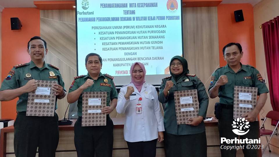 PURWODADI, PERHUTANI (11/01/2023) | Perhutani Kesatuan Pemangkuan Hutan (KPH) Purwodadi bersama Badan Penanggulangan Bencana Daerah (BPBD) Kabupaten Grobogan menandatangani Nota Kesepahaman tentang Penanganan Penanggulangan Bencana di wilayah kerja Perum Perhutani, Rabu (11/01).