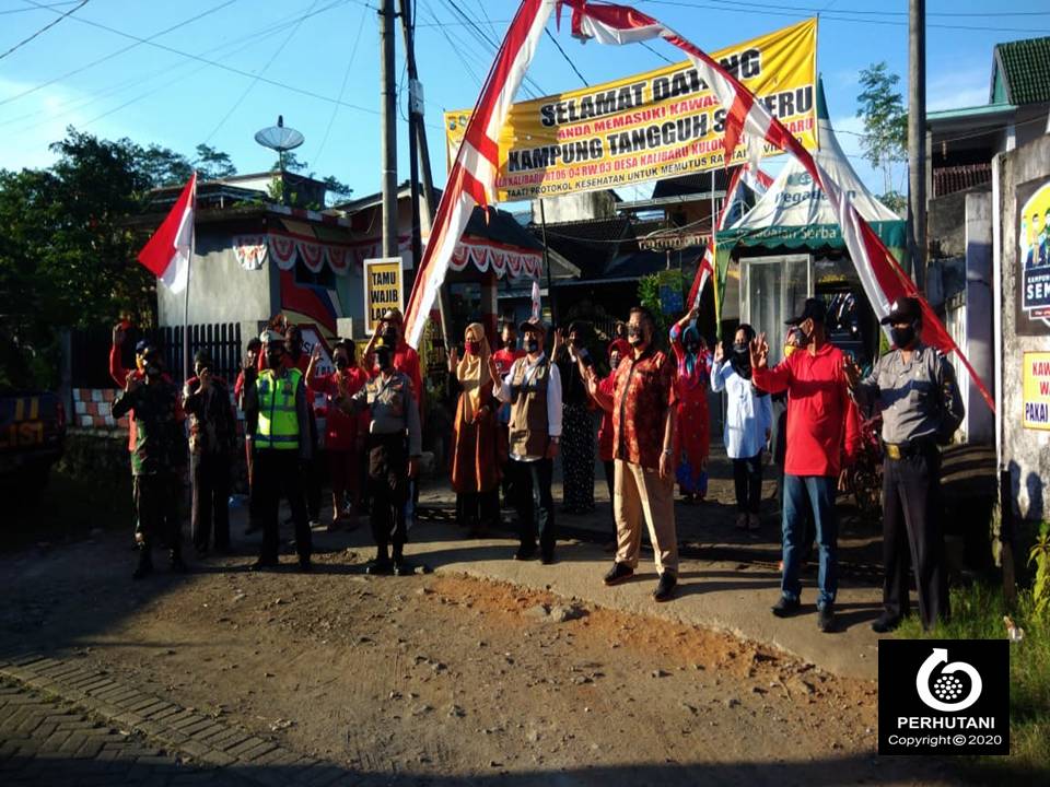 BANYUWANGI BARAT, PERHUTANI (7/8/2020) | Dalam rangka mencegah penyebaran Covid-19 Perhutani Kesatuan Pemangkuan Hutan (KPH) Banyuwangi Barat bersama Forum Koordinasi Pimpinan Kecamatan (Forkopimcam) Kalibaru menggelar acara kampanye pemakaian masker, bertempat di kampung tangguh desa Kalibaru Kulon Kecamatan Kalibaru, Kamis (6/8).