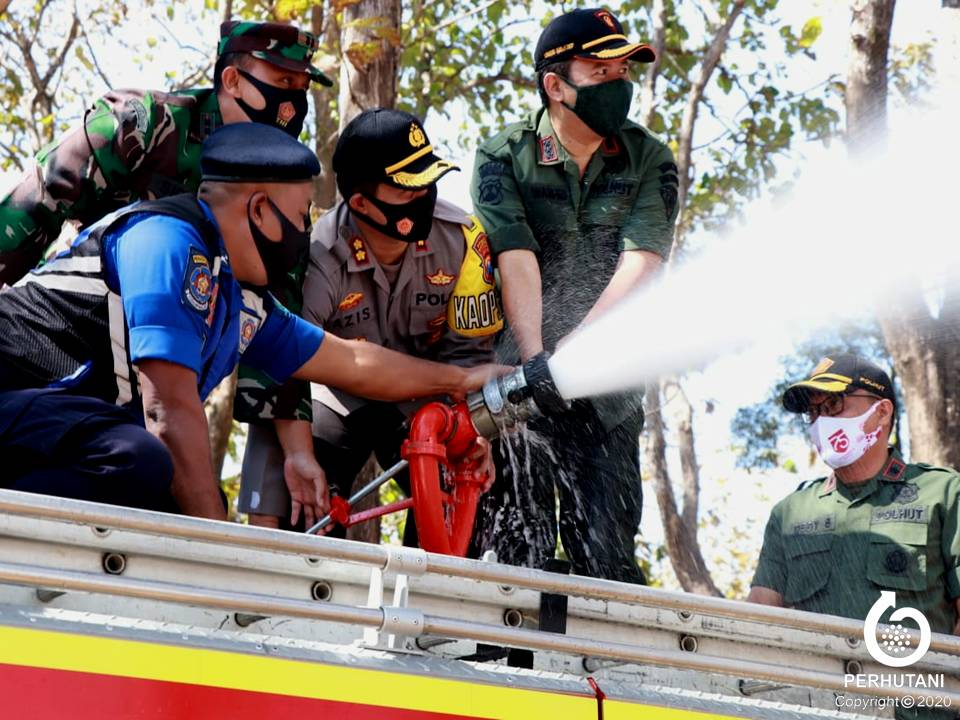 MADIUN, PERHUTANI (22/8/2020) | Perhutani Kesatuan Pemangkuan Hutan (KPH) Madiun bersama Forum Koordinasi Pimpinan Daerah (Forkopimda) Ponorogo menggelar kegiatan apel kesiapsiagaan dan simulasi dalam rangka Penanggulangan dan Pengendalian Kebakaran Hutan dan Lahan (Dalkarhutla), bertempat dipetak 34 wilayah Resort Pemangkuan Hutan (RPH) Setonggo, Bagian Kesatuan Pemangkuan Hutan (BKPH) Pulung yang secara administratif masuk Kecamatan Pulung Kabupaten Ponorogo, Sabtu (22/8).