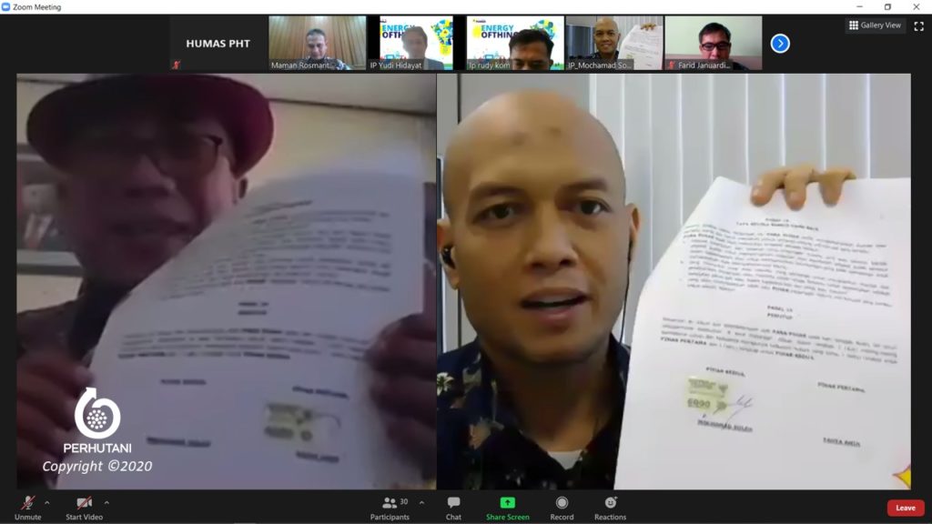JAKARTA, PERHUTANI (24/07/2020) | Dalam upaya pengembangan unit bisnis industri tanaman biomassa sebagai bahan baku bioenergi, Perum Perhutani bekerjasama dengan PT Indonesia Power memanfaatkan potensi biomassa berbasis hutan dalam mendukung cofiring pada PLTU PT. Indonesia Power. Kerjasama ini diwujudkan dalam penandatanganan Perjanjian Kerja Sama (PKS) Penelitian Uji Coba Cofiring Pembangkit Listrik Tenaga Uap (PLTU) yang dilakukan dengan video conference, Jumat (24/07).