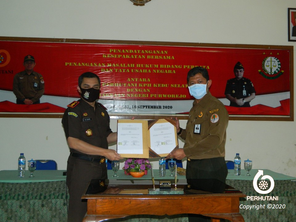 KEDU SELATAN, PERHUTANI (17/09/2020) | Perhutani Kesatuan Pemangkuan Hutan (KPH) Kedu Selatan bersama Kejaksaan Negeri (Kejari) Purworejo menandatangani kesepakatan bersama tentang penanganan masalah hukum bidang Perdata dan Tata Usaha Negara (PTUN) di aula kantor KPH Kedu Selatan, Rabu (16/09).