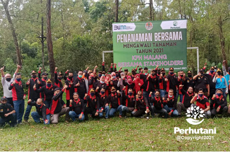 MALANG, PERHUTANI (11/1/2021) | Perhutani Kesatuan Pemangkuan Hutan (KPH) Malang bersama komunitas Malang Trail Klub (MTK) mengadakan penanaman berbagai jenis bibit pohon rimba campur dan buah-buahan yang dipusatkan di Wana Wisata Coban Talun wilayah Resort Pemangkuan Hutan (RPH) Pujon, Bagian Kesatuan Pemangkuan Hutan (BKPH) Pujon, Minggu (10/1).