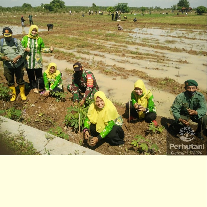 INDRAMAYU, PERHUTANI (04/12/2020) | Perhutani Kesatuan Pemangkuan Hutan (KPH) Indramayu bersama Lembaga Masyarakat Desa Hutan (LMDH) Wana Makmur melakukan kegiatan penanaman Kayu Putih di petak 27f, Bagian Kesatuan Pemangkuan Hutan (BKPH) Jatimunggul pada Kamis (03/12).