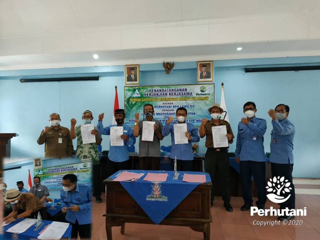 LAWU DS, PERHUTANI (3/3/2021) | Perhutani Kesatuan Pemangkuan Hutan (KPH) Lawu Ds melakukan penandatanganan Perjanjian Kerja Sama (PKS) dengan Perusahaan Daerah Air Minum (PDAM) Magetan dan  3 Lembaga Masyarakat Desa Hutan (LMDH) tentang pemanfaatan air dari kawasan hutan yang dilaksanakan di aula Kantor PDAM Magetan, Senin (1/3).