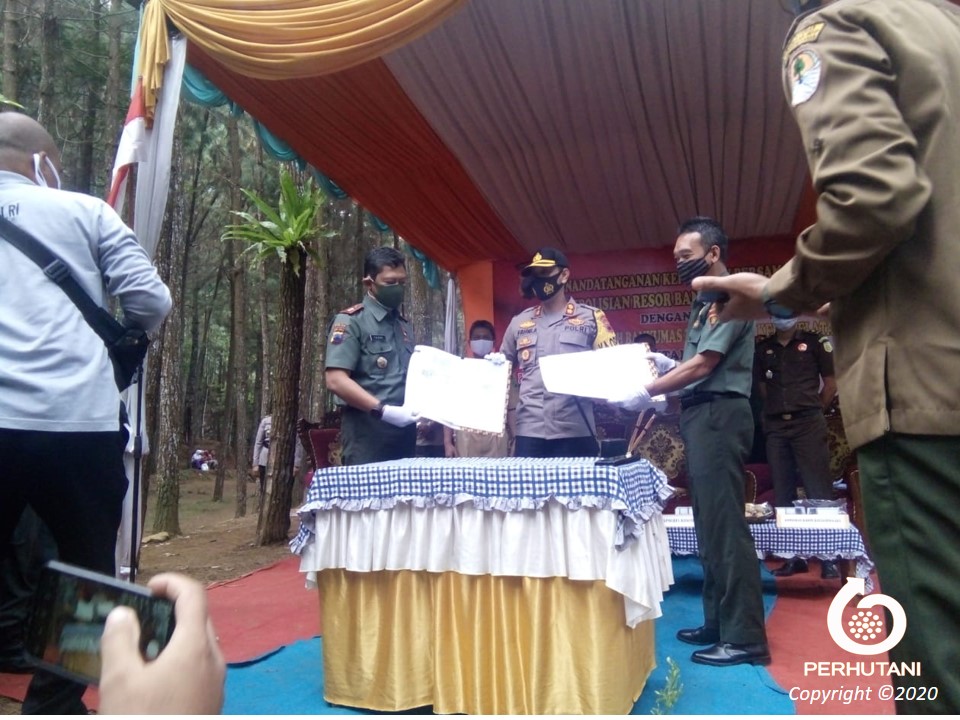 KEDU SELATAN, PERHUTANI (29/09/2020) | Kesatuan Pemangkuan Hutan (KPH) Kedu Selatan, KPH Banyumas Timur, dan Kepolisian Resor (Polres) Banjarnegara menandatangani Memorandum of Understanding (MoU) tentang pengamanan hutan dan penegakan hukum kawasan hutan yang masuk wilayah administratif Kabupaten Banjarnegara bertempat di Wisata Buaran Bendawuluh, Desa Pekandangan, Kecamatan Banjarmangu, Selasa (29/09).