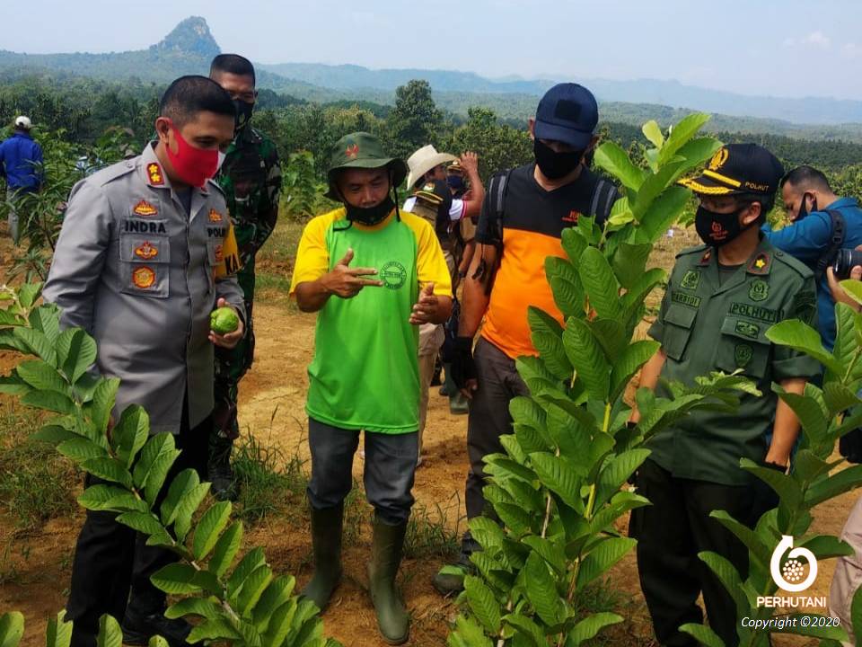 SUMEDANG, PERHUTANI (12/06/2020) | Dalam rangka ketahanan pangan, Perhutani Kesatuan Pemangkuan Hutan (KPH) Sumedang bersama Polres Sumedang dan Kelompok Tani Hutan (KTH) Mitramukti melakukan penanaman Jambu Kristal pada lahan seluas 24,27 Ha di petak 82f Resort Pemangkuan Hutan (RPH) Bugel, Bagian Kesatuan Pemangkuan Hutan (BKPH) Tomo Utara KPH Sumedang, Kamis (11/06).