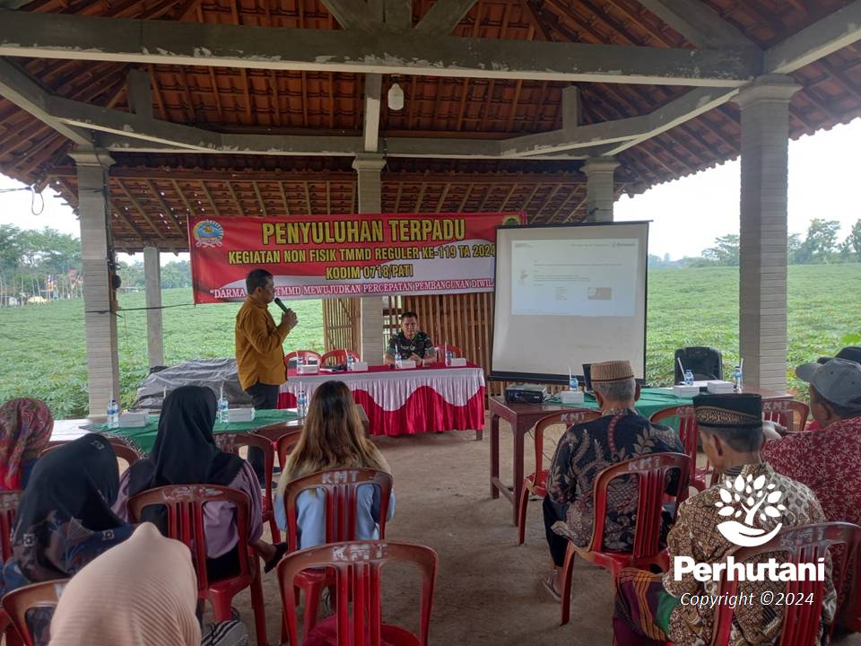 PATI, PERHUTANI (07/03/2024) | Perhutani Kesatuan Pemangkuan Hutan (KPH) Pati mendukung kegiatan TNI Manunggal Masuk Desa (TMMD) Reguler bersama Komando Distrik Militer (Kodim) 0718 Pati pada Kegiatan Penyuluhan Terpadu di Aula Dukuh Tegalombo Desa Tanjungrejo Kecamatan Margoyoso Kabupaten Pati, Kamis (07/03).
