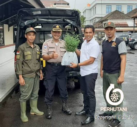 KEDU UTARA, PERHUTANI (10/1/2020) | Perhutani Kesatuan Pemangkuan Hutan (KPH) Kedu Utara berpartisipasi memberikan bibit bintamin sebanyak 200 plances kepada Polisi Resort Kota (Polresta) Magelang dalam rangka Polri Peduli Penghijauan sebagai wujud dukungan dalam mensukseskan program nasional penghijauan untuk pemulihan daerah aliran sungai.