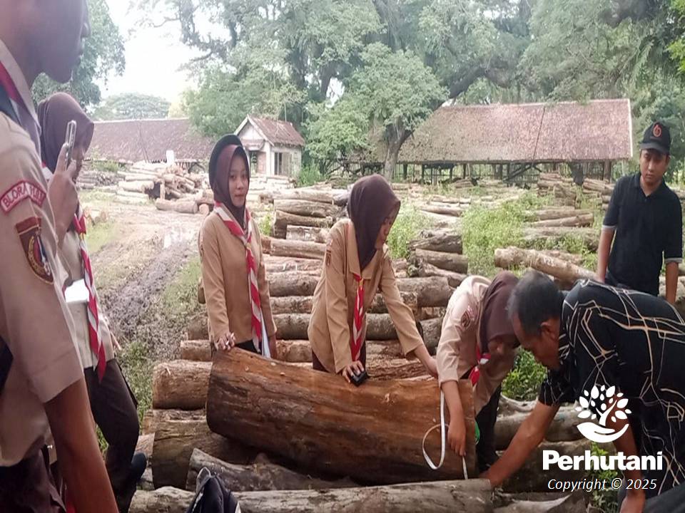 BLORA, PERHUTANI (24/02/2025) | Kesatuan Pemangkuan Hutan (KPH) Blora mendukung Pramuka Saka Wanabakti binaannya melaksanakan kegiatan Praktik Pengukuran Kayu di Tempat Penimbunan Kayu (TPK) Banjarwaru, Sabtu (22/02).